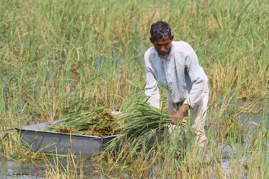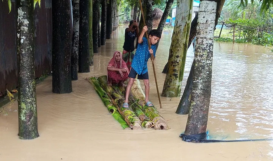 কোলের শিশুকে কাঁধে নিয়ে বন্যার পানি ভেঙে ত্রাণের খোঁজে যাচ্ছেন এক ব্যক্তি। জোগানিয়া কান্দাপাড়া, নালিতাবাড়ী